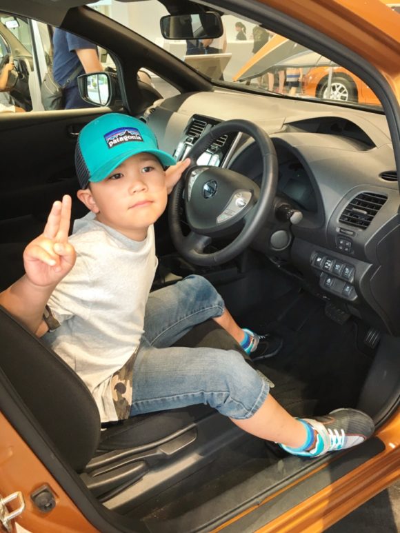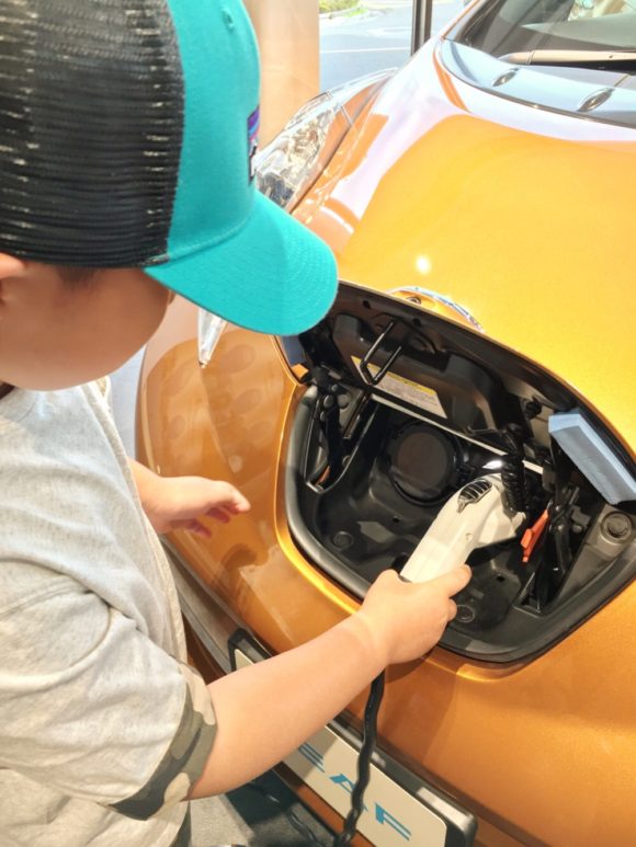 ▲電気自動車の充電の装着も自由に体験!