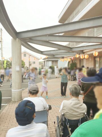 周りを見ると、車イスに乗り、浴衣を着て盆踊りを楽しんでいらっしゃるご利用者さん。