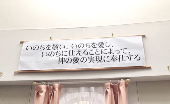 ▲ホールには『社会福祉法人 三育福祉会』の理念が大きく掲げられています