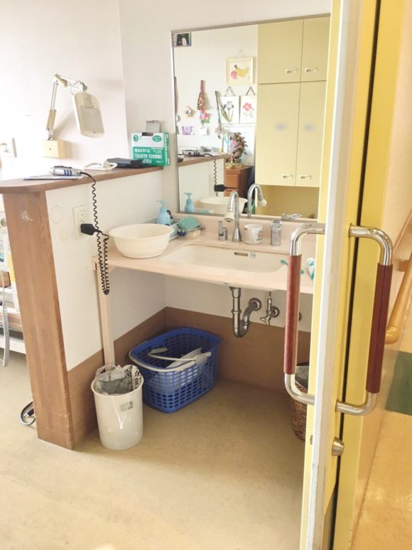 ▲こちらの洗面台は元々戸棚がついていましたが、車椅子の利用者さんも使いやすいよう扉を取り外し、十分なスペースがとられています。