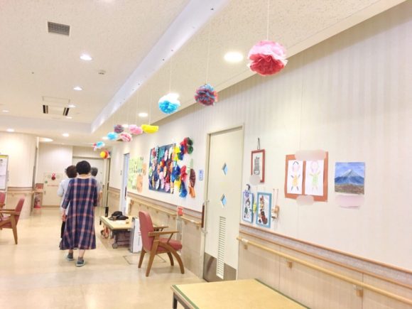 入り口や廊下に作品が賑やかに飾られています。カラフルな飾りに、こちらも楽しくなります♪