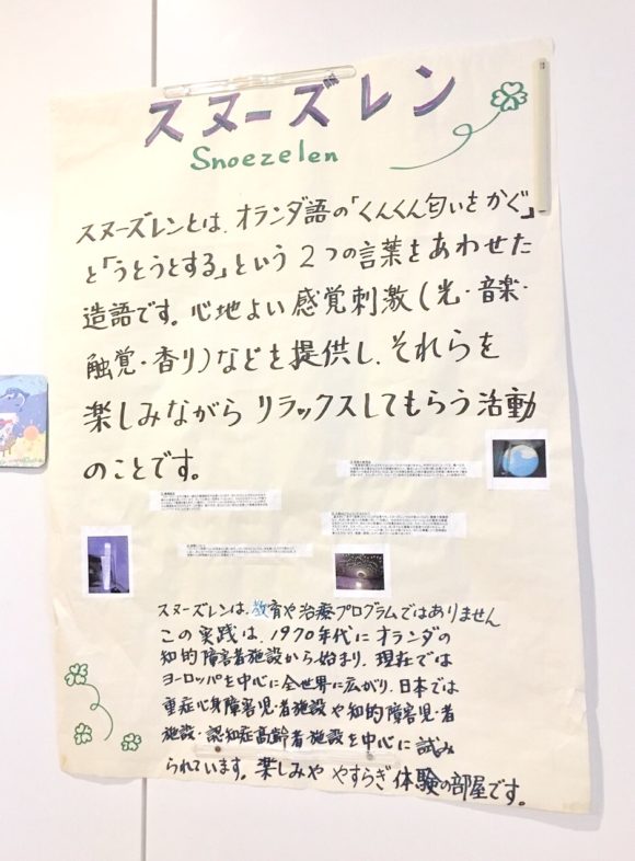 奥のバブルチューブはブクブクブクという振動が母親の胎内にいた時と似ているため、抱きついてリラックスする利用者さんもいらっしゃるのだとか。