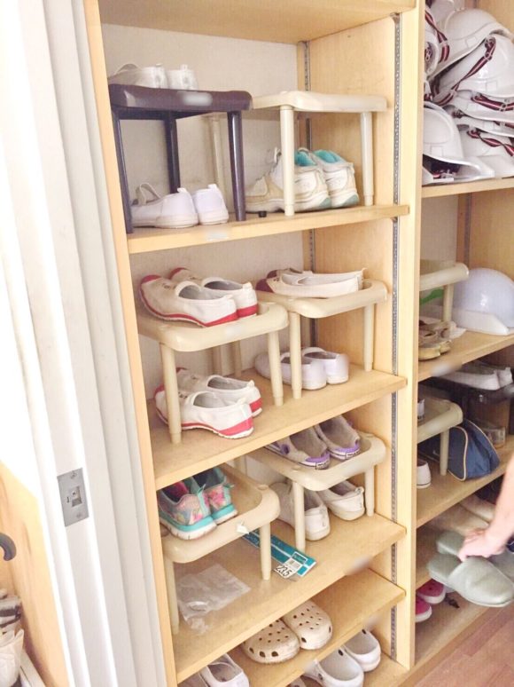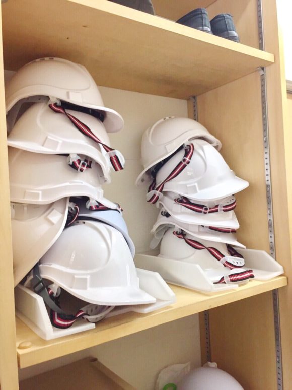 ▲いざという時にすぐ持ち出せるように防災用ヘルメットは下駄箱の横に置かれていました。