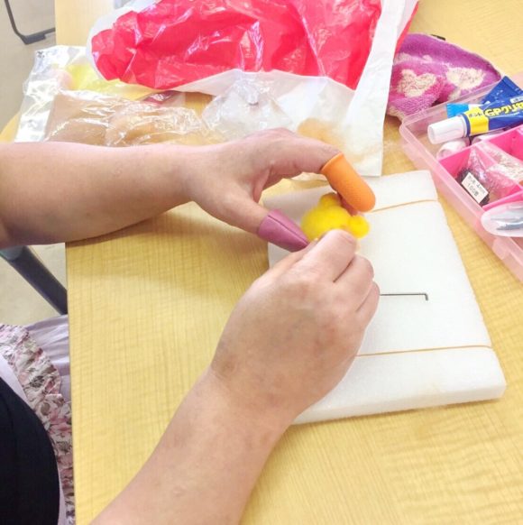 ▲羊毛フェルト作業では、羊毛のわたにニードルを突き刺し、刺し固めて形を作っていきます。
