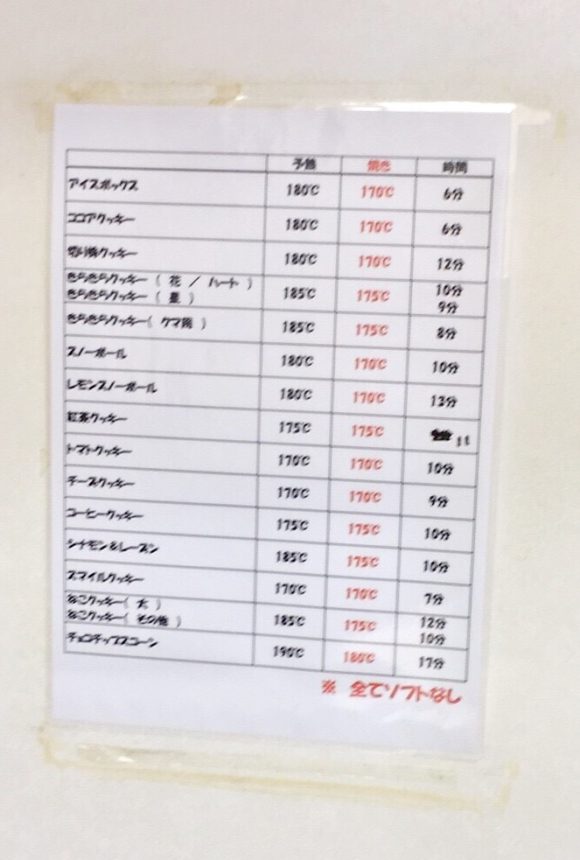 ▲10種類以上あるクッキーは、それぞれ余熱や焼く際の温度・時間が違います。こちらで確認すれば間違えることもありません!