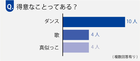 好きこそものの上手なれ、好きなダンスや歌が得意なことでも上位に入っています。『お手伝いが得意』というお子さんも3人。うらやましいです!