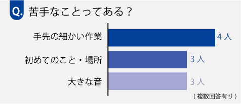 苦手なことは実にそれぞれ。それでも、手先の細かい作業、初めてのこと・場所、大きな音など、他の障害児にもよくみられる特徴がここでもみられました。中には『指先が器用なのか、細かい作業をするのが好き』(匿名希望)というお子さんもいらっしゃいました。その他…算数、箸、時計、速いテンポのダンス、じっとすること、暗闇、怒声、きょうだいのけんか、顔のまわりを触られること、足元が不安定な場所、持久力のいる運動、階段、走ること、せまい所、虫、おばけ、食事、日常生活の基本的なこと、ひとりぼっち、動物、べたべたするものを触ること…などたくさんありました。