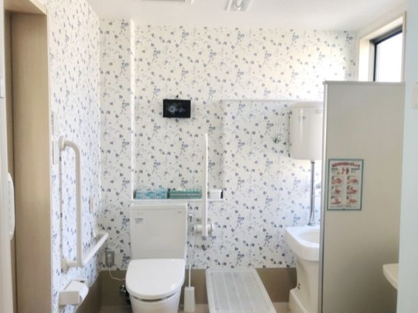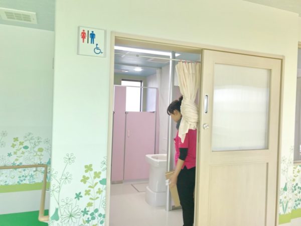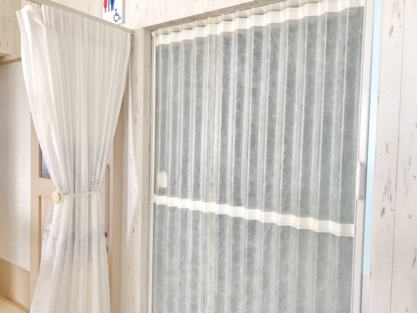 ▲浴槽の出入り口に敢えて透け感のあるアコーディオンカーテンを採用したのはちょっと挑戦でしたが、ぼんやりとしたシルエットで利用者さんが入浴から出られたことがわかるので良かったです。