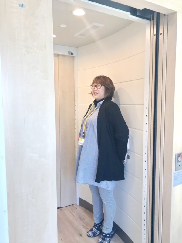 また、エレベーター内部は軽くカーブしていて、車椅子の人と一緒にスタッフも乗り込めるようになっています(写真右)。