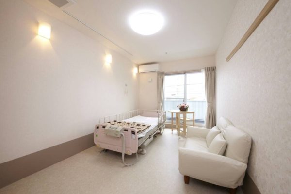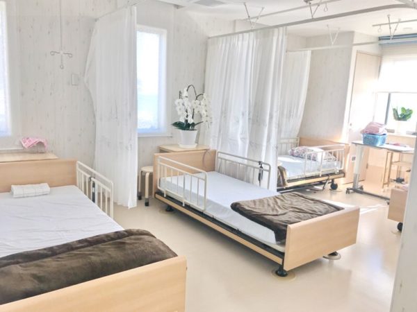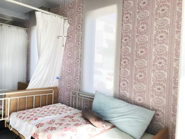 寝たきりの方にお家にいるように気持ちよく過ごしてもらえるように、壁紙からベッド間を仕切るレースのカーテンにまでとことんこだわっています。
