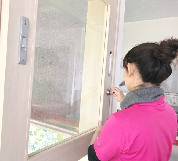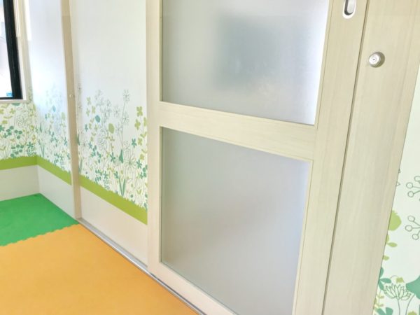 状態が落ち着いているときは開放していますが、ケアが必要な時は、他の子どもたちが入ってこられないように、扉には鍵を設置しています。(写真右)。