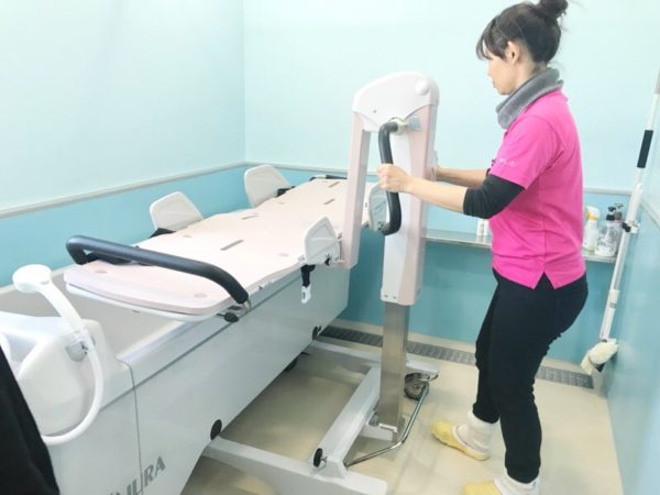 また、このリフトは移動式なので、ベッドから利用者さんが寝たままの状態で移動して、そのままの姿勢で湯船に入ってもらうことができます(写真右)。