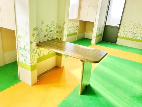 ▲なんと作りつけの机が登場。この机で子どもたちがご飯を食べたりお絵かきをしたりするそうです。