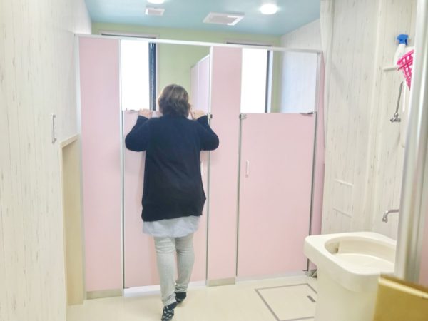 子ども用のトイレということで、個室の扉はプライバシーを確保しつつ、何かあったら中の様子を覗けるように絶妙な高さのものを採用しています。