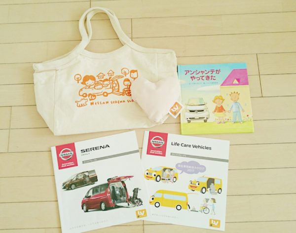 ▲日産オリジナルのトートバッグに、パンフレットや絵本、ミニクッションなど嬉しいお土産。