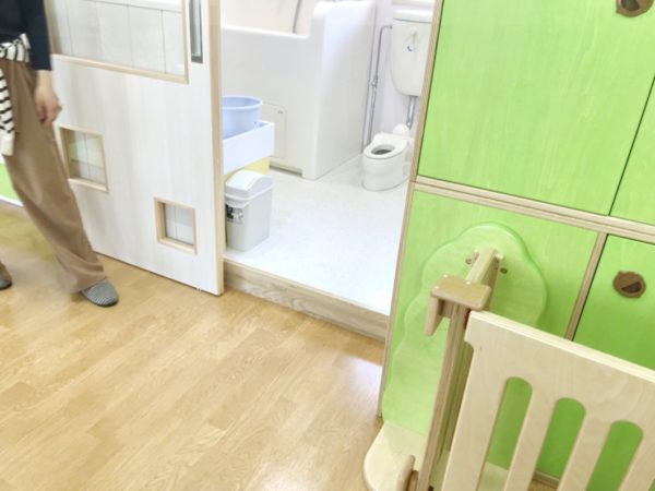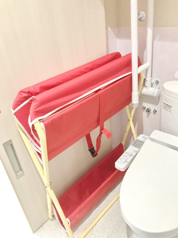 限られたスペースを有効活用するために、オムツ替えベッドは折りたたみ式を採用。普段は大人用トイレの片隅に収容されています。