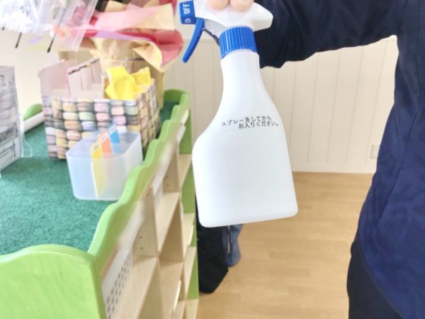 ▲玄関には手指の消毒用に薄めたスプレーを置いています。高濃度の物は、ノロウィルスなどの嘔吐物の消毒にも使えます。