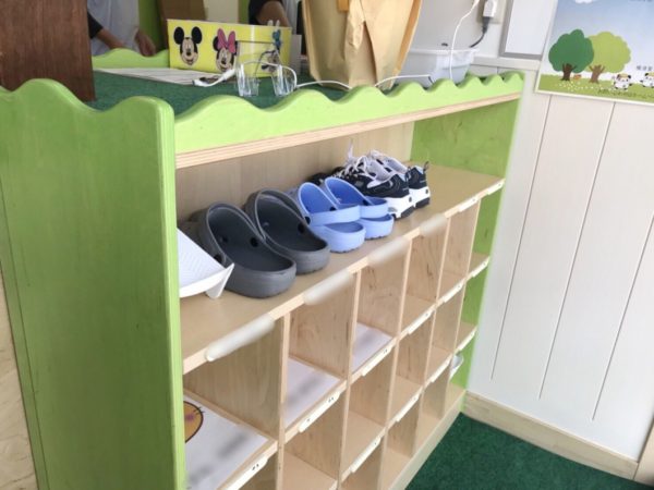 ▲下駄箱には園児の名前が書かれた下敷き。スムーズに靴の着脱を行います。