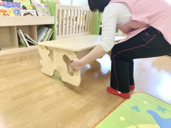 脚部がかわいいリスをモチーフにした木のぬくもりを感じる園児用の机ですが、これにも仕掛けがあります。