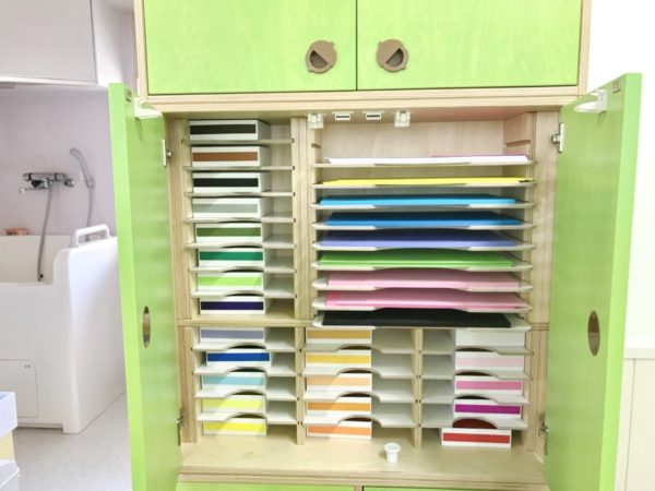 その中のひとつの扉を開くと、中にはきれいに整列した画用紙と折り紙!