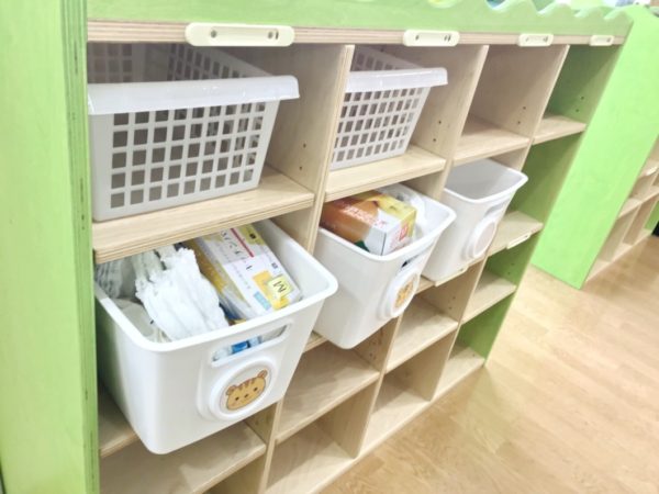 ▲オムツや着替え、ポリ袋などがストックしてあります。