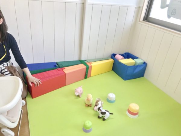 ▲ケージで仕切られた先は0歳児スペース。マットとやわらか素材のおもちゃが揃っています。