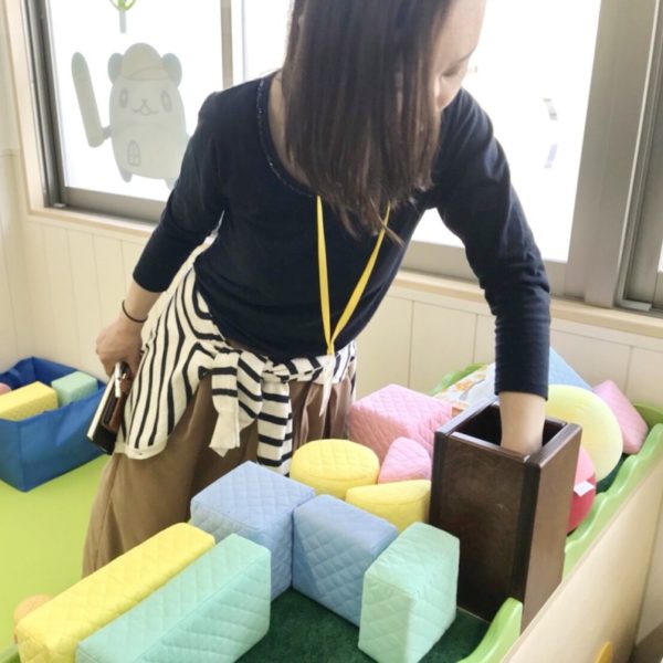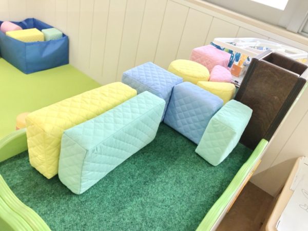 0歳児スペースに置いてあったおもちゃは、シンプルなソフトトイや組み替えて平均台のように遊べるソフトブロックなどが適度に配置されていて、園児は組んで登ってみたり、投げてみたり…。