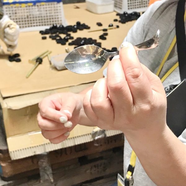 ▲ここで登場するのはスプーン。このスプーンを使い、テコの原理で黒いゴム製の穴に金属の部品を押し込んでいきます。柄の曲がり具合から、いかに力を使うか想像できますね…