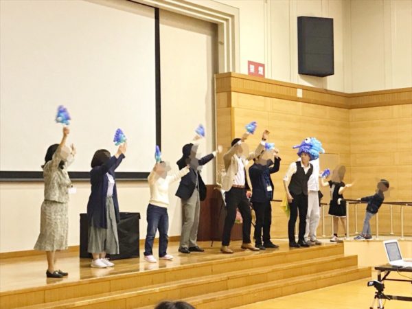 ▲指名された来場者が壇上に並び、一緒にバルーンダンス!大人も子どもも楽しくフリフリ。