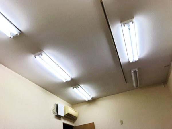蛍光灯が並んでいる天井はダウンライトとペンダントライトに変更予定