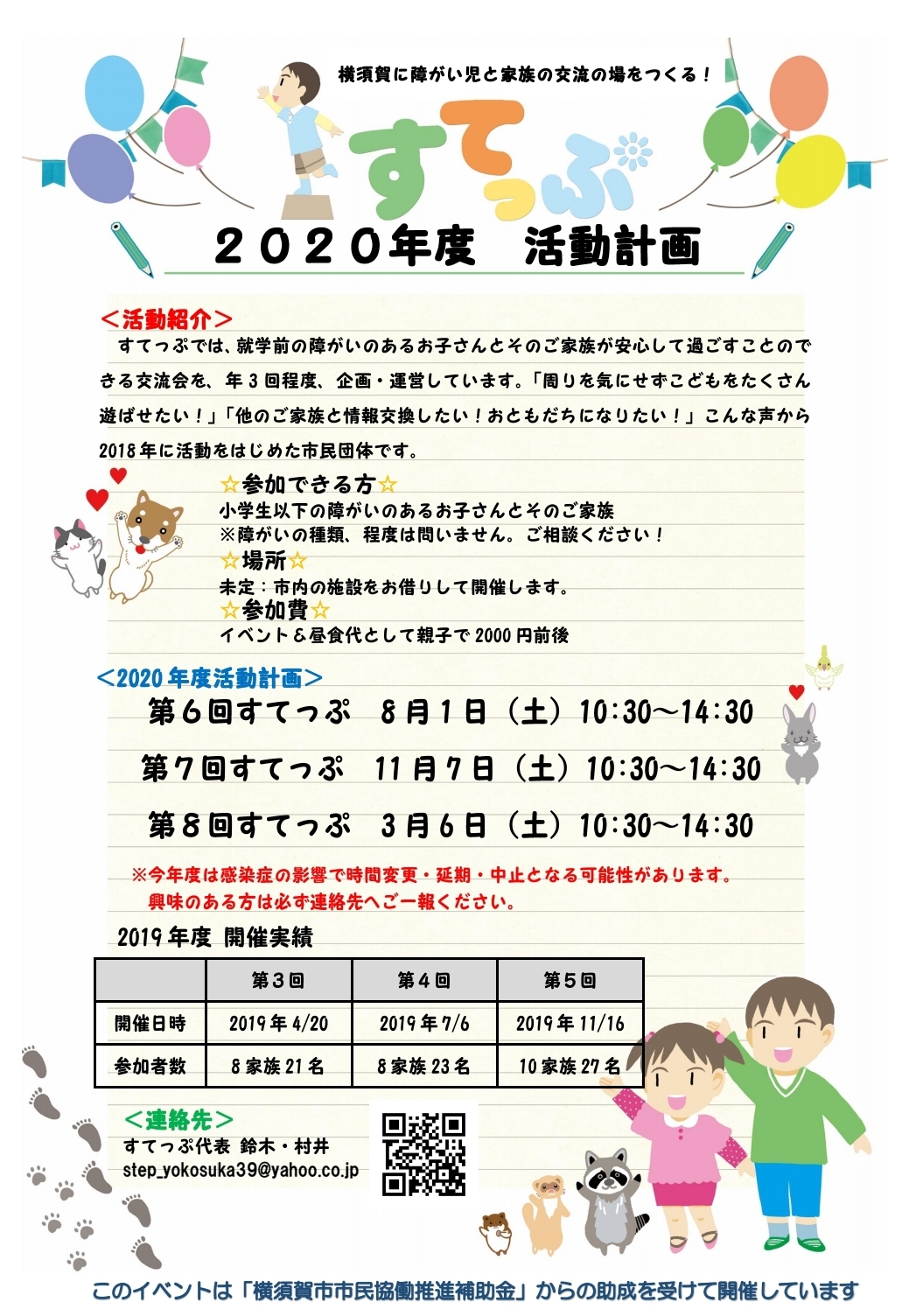 2018年より活動をはじめ、横須賀で障がい児とそのご家族の交流イベントを定期的に開催している市民団体『すてっぷ』さんより、2020年度の活動計画が届きましたのでお知らせします!