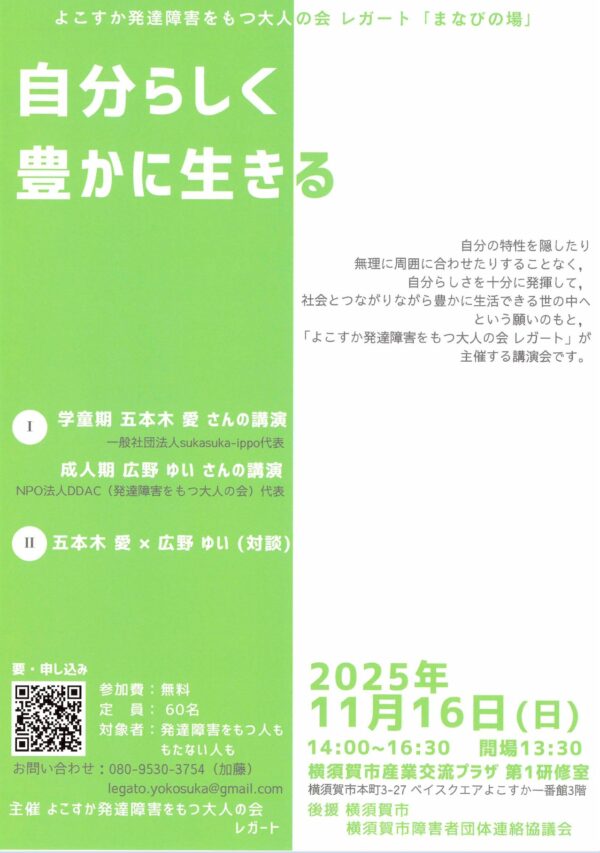 - 【講演会】『自分らしく豊かに生きる』主催:よこすか発達障害をもつ大人の会レガート - 2025-10-27