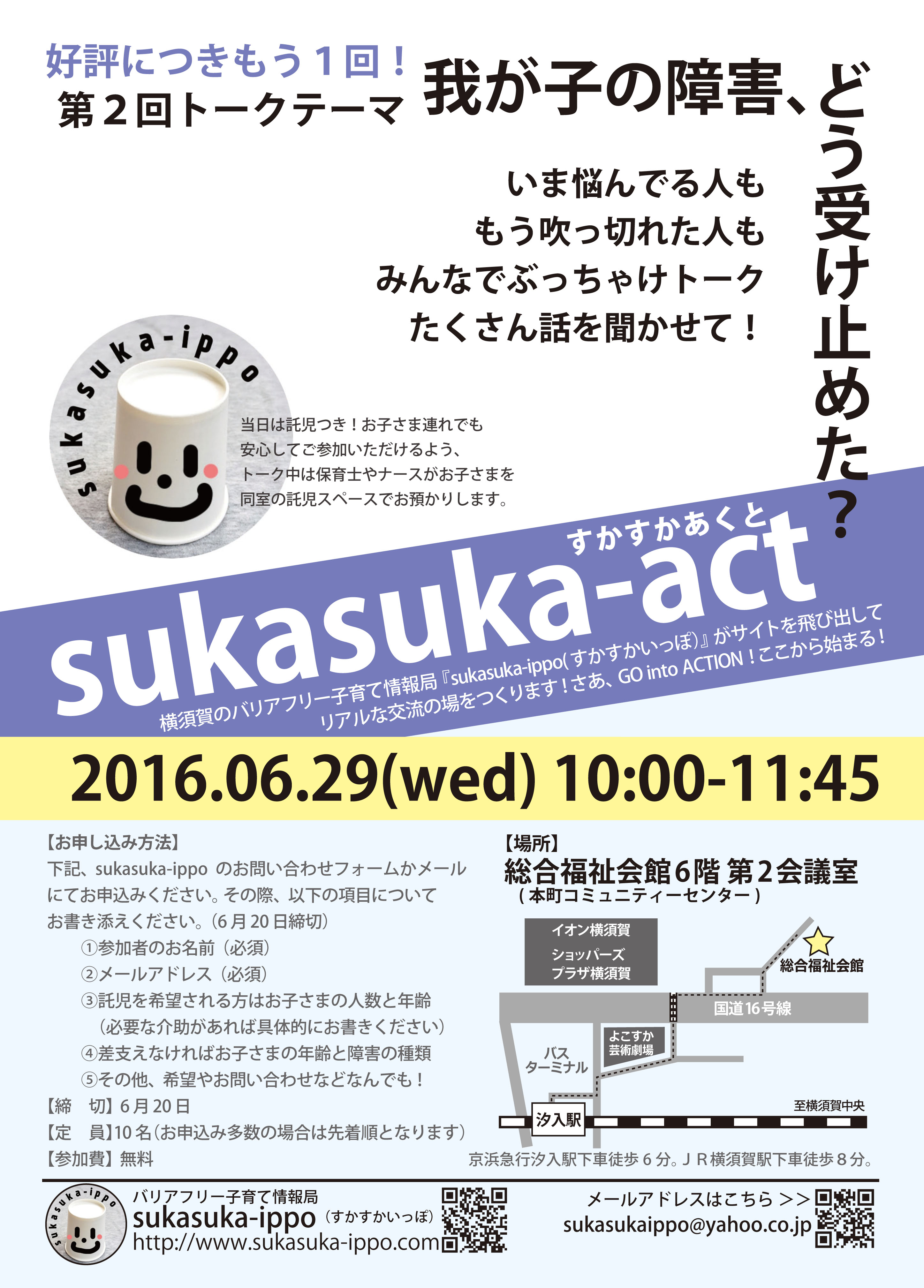 横須賀のバリアフリー子育て情報局『suaksuka-ippo(すかすかいっぽ)』がサイトを飛び出して、リアルな交流の場『sukasuka-act(すかすかあくと)』を毎月開催!今回はその第2回目、トークテーマは前回好評だった『我が子の障害、どう受け止めた?』をもう一度。