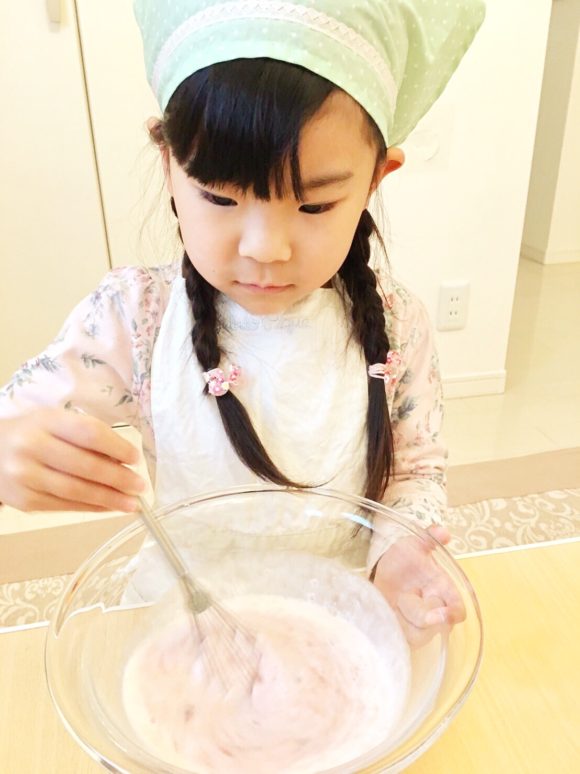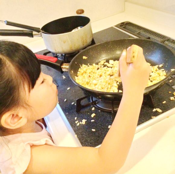 私はこぼさないか、はらはらしてちびっ子シェフの助手をしています。