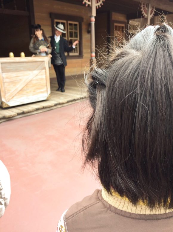 さて、ここで思わぬ事態…。先に進もうと思ったら、入口近くのミニショー『アナと雪の女王コント』にうららさん、早速釘づけ。全く先に進めず、みんなでうららさんとミニショーが終わるまで待機。