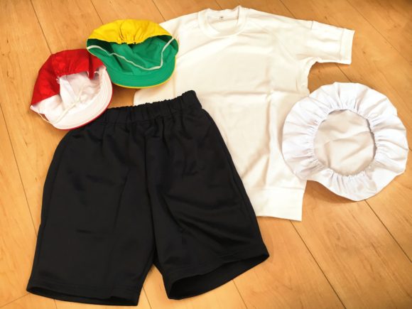 ▲体操服は上は白で半袖(長袖)、下は紺のハーフパンツかクォーターパンツ。2色のカラー帽子2種類を購入。そして給食帽。