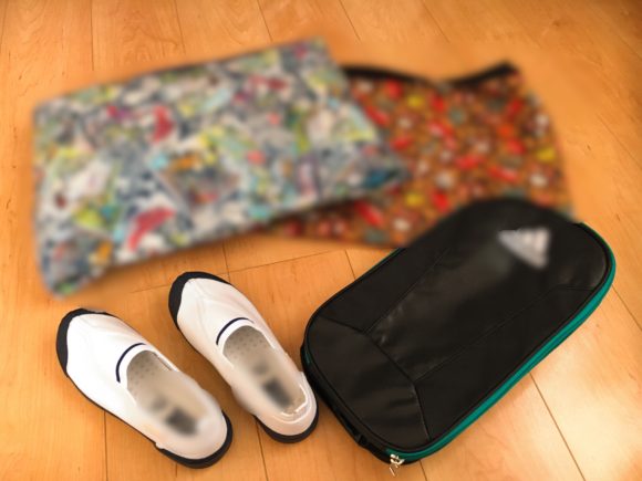 ▲上履きはバレーシューズ型ではなく、体育館履きという指定。上履き入れは、上履きがすごく汚れるので布製のものより袋型のものが良いよとママ友からアドバイスをもらったので、こちらを購入。防災頭巾(座布団)は交流級と支援級の両方に置いて使うので2つ用意。
