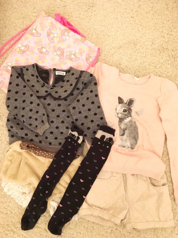ちなみに、レギンスやタイツは足が引っかかってしまい着替えにくいので、通園の日は履きません。半ズボンの日はニーハイやハイソックスを合わせています。