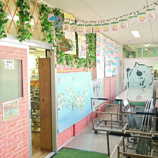 ▲会場となったのは校内にある『森のとしょかん』。その名の通り、緑の葉いっぱいの壁飾りが印象的です。